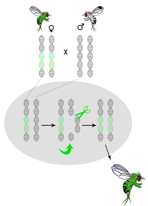 Legende: Gene Drives werden an alle Nachkommen weitervererbt. Üblicherweise würde bei den Nachkommen dieser Fruchtfliegen die gentechnische Veränderung (in Grün) nur auf dem, von der Mutter weitergegebenen Chromosom sitzen. Der eingebaute Kopiermechanismus (der zusammen mit der gentechnischen Veränderung weitervererbt wird), sorgt aber dafür, dass diese Genvariante auch in das vom Vater stammende Chromosom einkopiert wird. Am Ende des Prozesses sind alle Nachkommen des Fruchtfliegenpaares homozygot (reinerbig) auf das künstlich beigefügte Genvariante: das heisst, sie tragen auf beiden Chromosomen die gleiche Kopie des Gens. Weil sich dieser Prozess bei jeder Paarung wiederholt, tragen nach wenigen Generationen alle Nachkommen im Stammbaum die gentechnische Veränderung (alle Nachkommen grün).